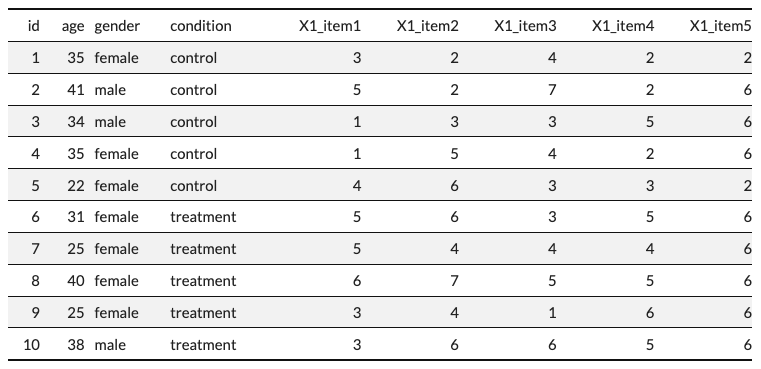 15 | 22 | female | treatment | 4 | 3 | 4 | 6 | 6 | 5 | 23 | X1_item1, X1_item2, X1_item3, X1_item4, X1_item5 | 0 | ||